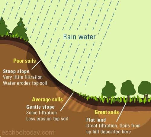 However, over gentle slopes where erosion is slow and percolation of water is good, the soil formation is very favorable. Thus, the soils over gentle slopes and flat areas may develop a thick layer of clay with the accumulation of organic matter. Also, slopes may be exposed to more direct sunlight, which may dry out soil moisture and render it less fertile.